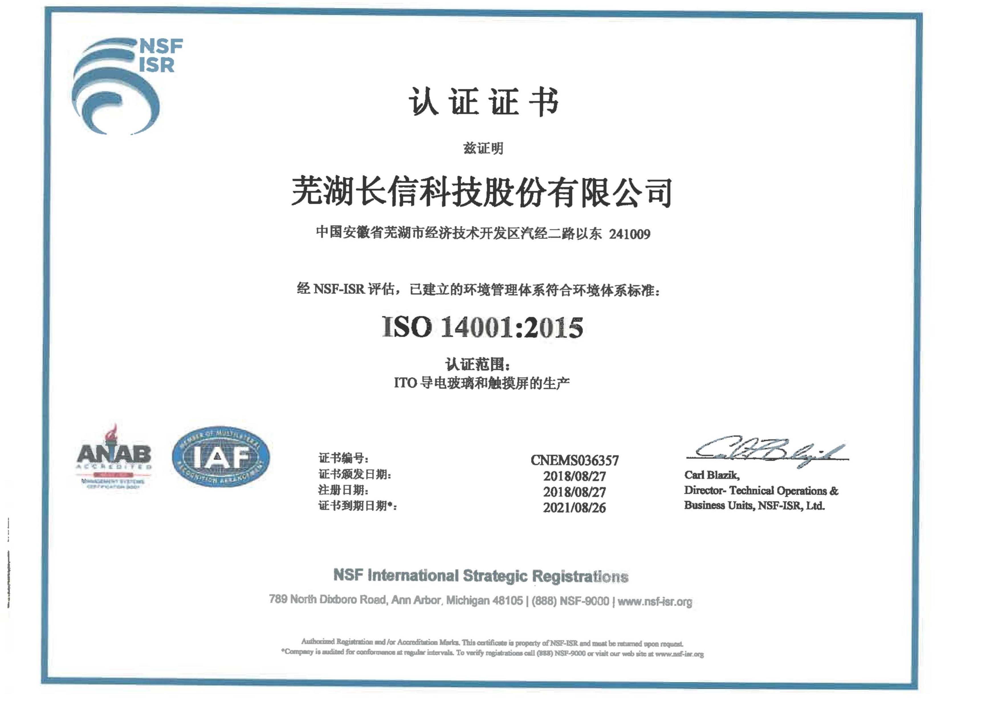 ISO14001-2015環(huán)境管理體系英語証明書